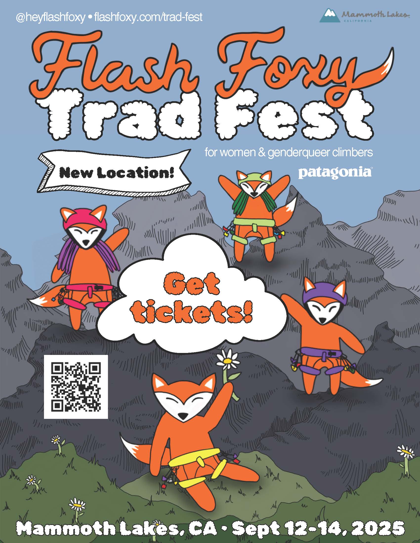 This is our first year in Mammoth Lakes, CA, and we're excited to be on the East Side for an epic weekend of community building, skill sharing, and play! We hope that the Flash Foxy Trad Fest will not only reach experienced climbers but also provide a safe space for beginner climbers to come and learn more about all that climbing has to offer. We held this festival in Chattanooga from 2017 to 2019 and in North Conway, NH from 2022-2024. We hope that moving our location every few years will allow new folks to attend the event and grow our community!