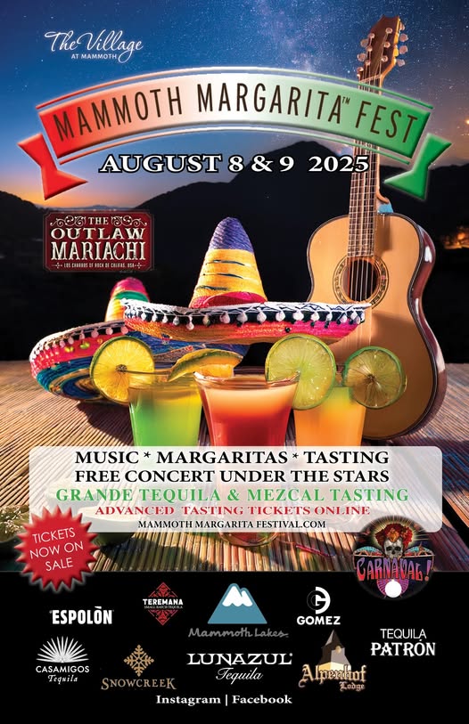 Celebrate fine food, music and tequila at the Mammoth Margarita Fest. Sip and enjoy your summer at the margarita bars serving skinnies, blends, peach, mango, strawberry, monster, Mammoth, jalapeno sting and more! Four amazingly talented bands/duos, 15 to 25 tequila distilleries, and more than 75 tasting opportunities!